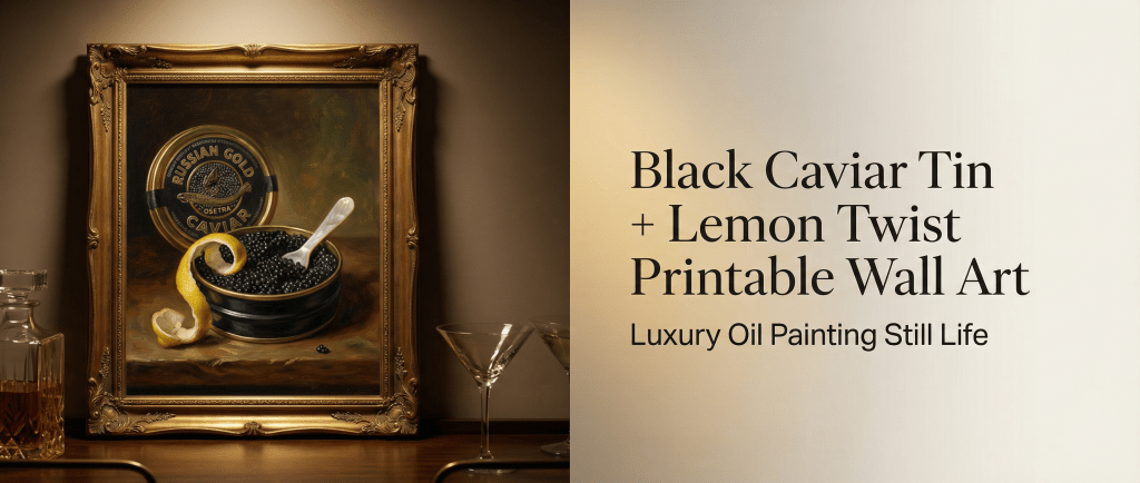 A collectible gallery-style still life: a black caviar tin, lemon twist, and mother-of-pearl spoon rendered in warm museum lighting—quiet luxury with a crisp editorial finish.