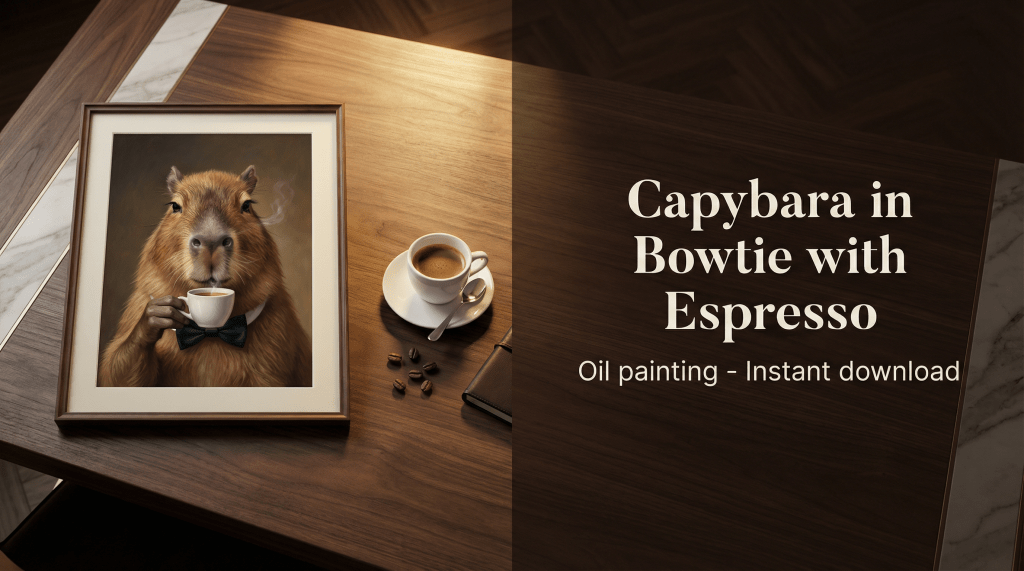 A collectible whimsical-luxury oil painting printable featuring a capybara in a bowtie paired with espresso—warm museum lighting, rich brushwork, and an editorial finish designed to look stunning in common frames. A bowtie capybara with espresso—whimsical luxury printable wall art in premium oil painting realism (300 DPI, instant download).