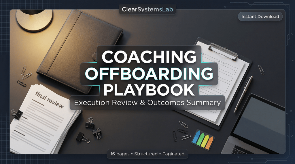 This playbook is a structured off-boarding system designed to formally close coaching, consulting, or advisory engagements. It provides a clear process for reviewing work delivered, validating outcomes, capturing insights, and completing the engagement in a professional and organized way. Instead of ending relationships informally, this playbook ensures the final phase is intentional, documented, and value-driven.