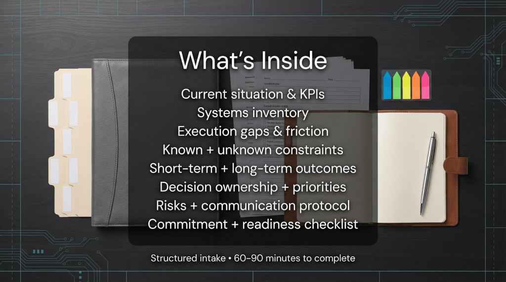 A structured onboarding workbook that surfaces assumptions, clarifies constraints, and creates alignment before execution begins.