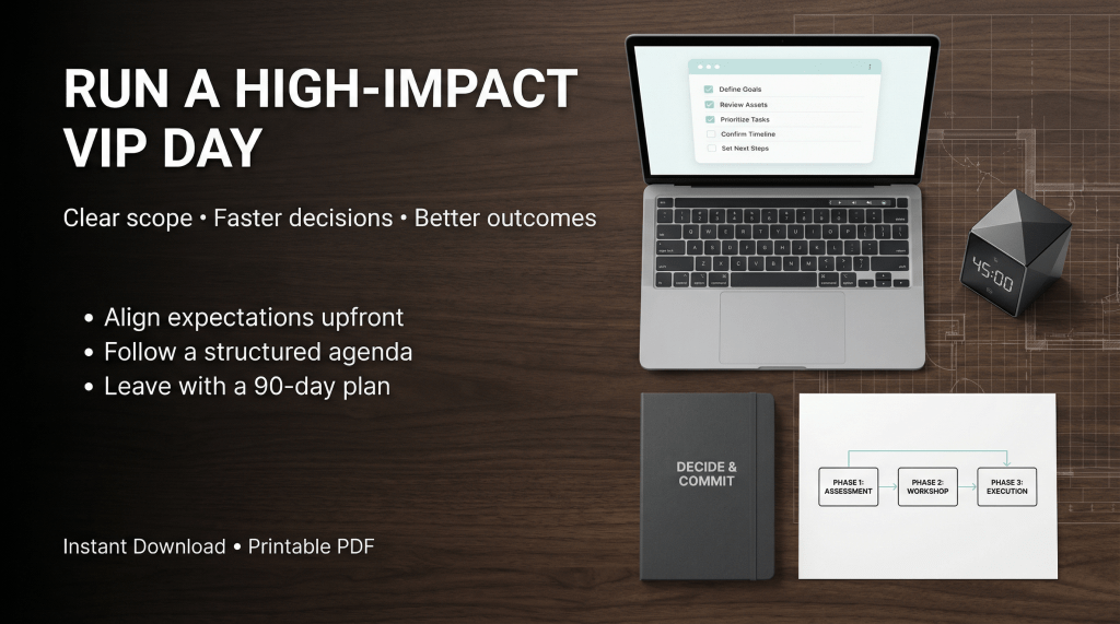 VIP Days fail when clients show up unclear, unprepared, or misaligned on outcomes and logistics. That leads to wasted time, scope creep, and reduced perceived value.