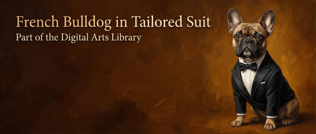 A distinguished French Bulldog dressed in evening formalwear — timeless, elegant, unexpectedly refined.