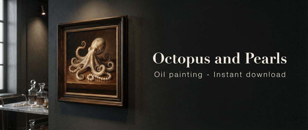 A collectible surreal still life: octopus + pearls in museum-grade oil realism. Instant download includes 5× 300 DPI JPGs for popular print ratios and sizes. Quiet luxury with bite: a pearl-draped octopus still life in collectible oil realism.