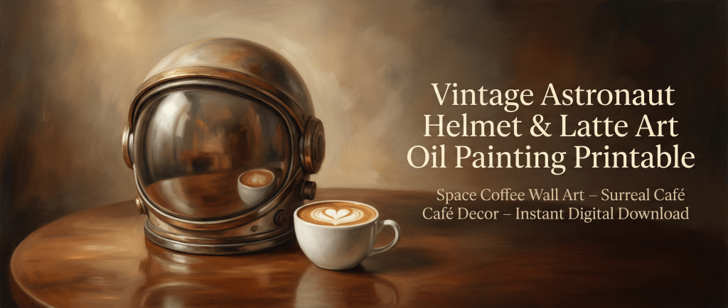 Vintage astronaut helmet and latte art oil painting printable. Surreal café wall decor in warm vintage tones. High-resolution 300 DPI instant digital download. A quiet moment between the cosmos and coffee.